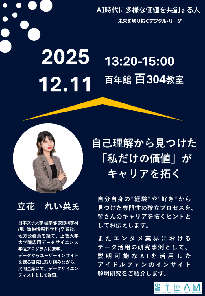 概要:自分自身の”経験”や”好き”から見つけた専門性の確立プロセスを、皆さんのキャリアを拓くヒントとしてお伝えします。またエンタメ業界におけるデータ活用の研究事例として、説明可能なAIを活用したアイドルファンのインサイト解明研究をご紹介します。